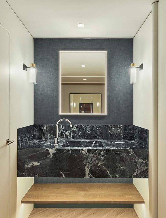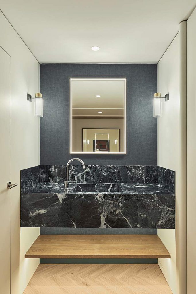 En el baño, el tono cambia: un lavabo suspendido en mármol verde veteado se convierte en la pieza escultórica del conjunto. El espejo retroiluminado y los apliques de vidrio aportan una luz tenue y cálida que contrasta con la mineralidad de la piedra.