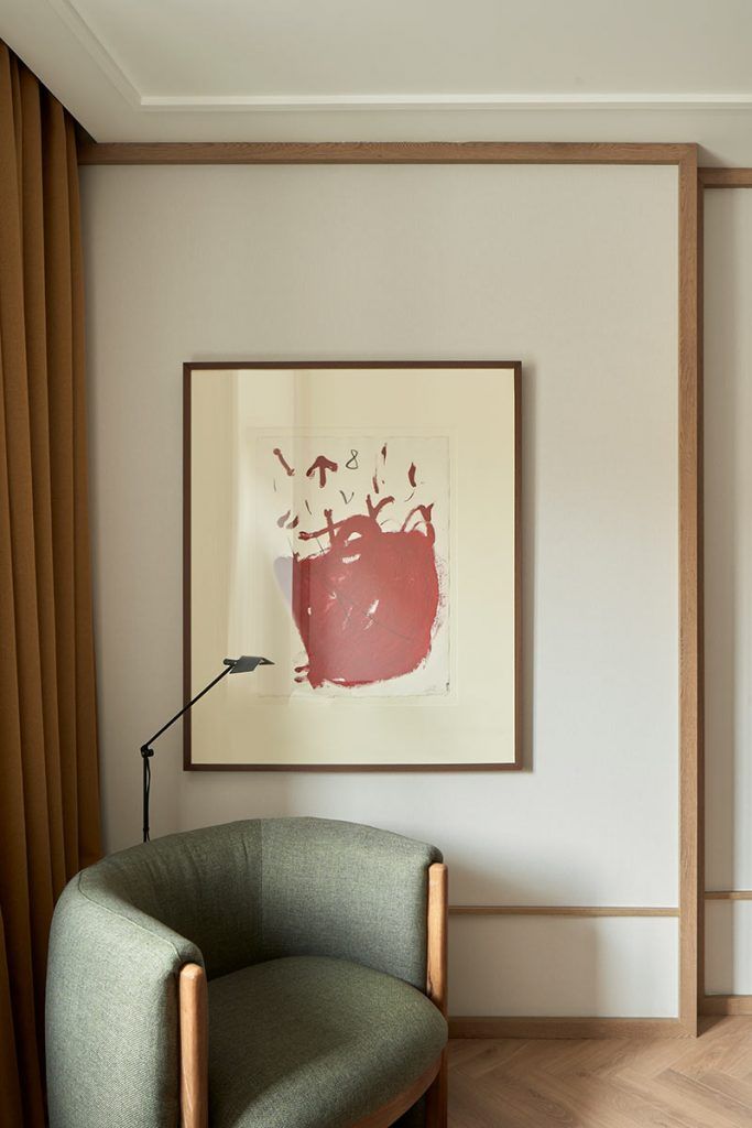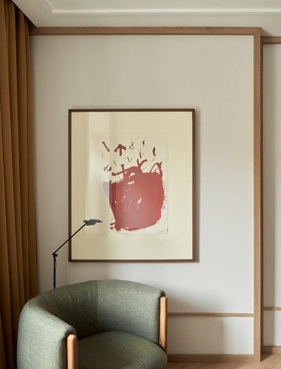 El rincón de lectura junto a la ventana se convierte en un pequeño salón, enmarcado por cortinas pesadas en ocre. Preside este espacio una obra original de Antoni Tàpies, que aporta profundidad y carácter al ambiente.