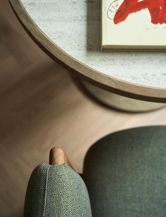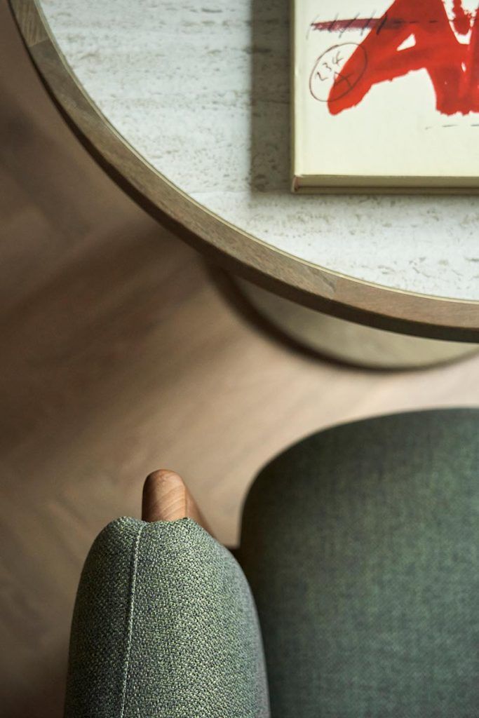 La zona de estar se compone de piezas robustas y compactas: una mesa con sobre de piedra y base de madera maciza, y butacas completamente tapizadas que reposan directamente sobre el suelo. El banco-maletero, generoso en tamaño, permite alojar dos maletas abiertas con total comodidad.