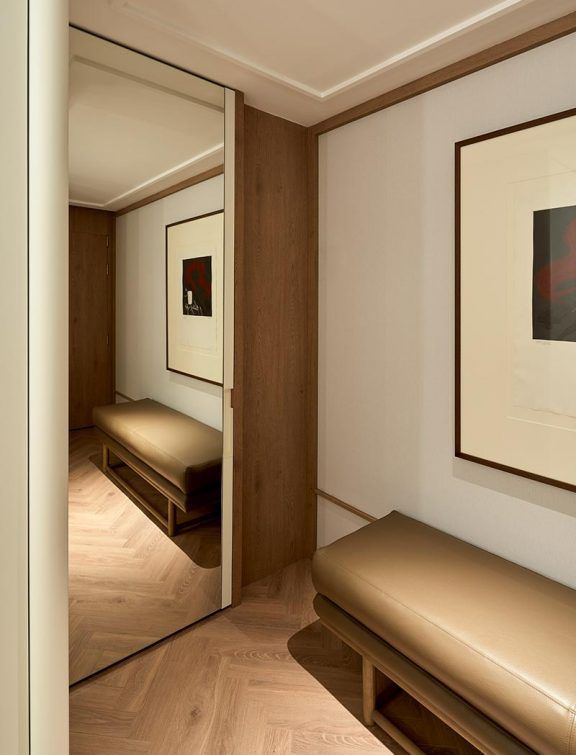 Las paredes se han revestido con papel vinílico liso en tono beige, aportando una textura suave y uniforme al conjunto. Están enmarcadas por listones de roble que generan ritmo y calidez en todo el perímetro de la habitación. El pavimento, en espiga, también de roble, refuerza esta idea de continuidad y confort.