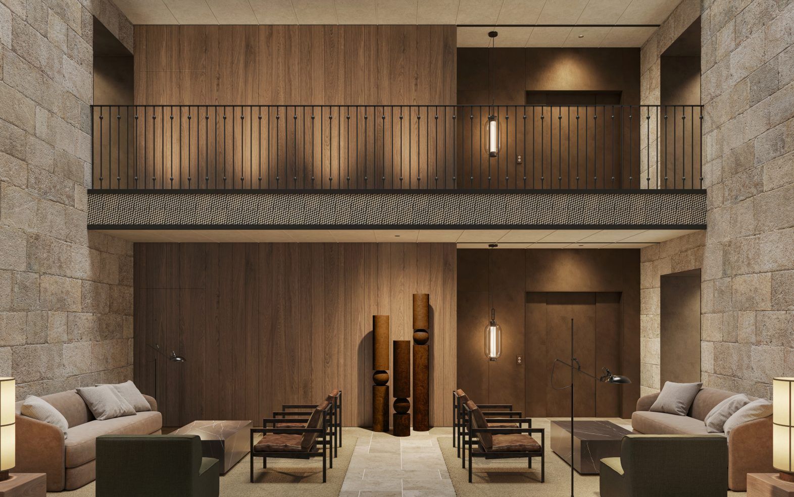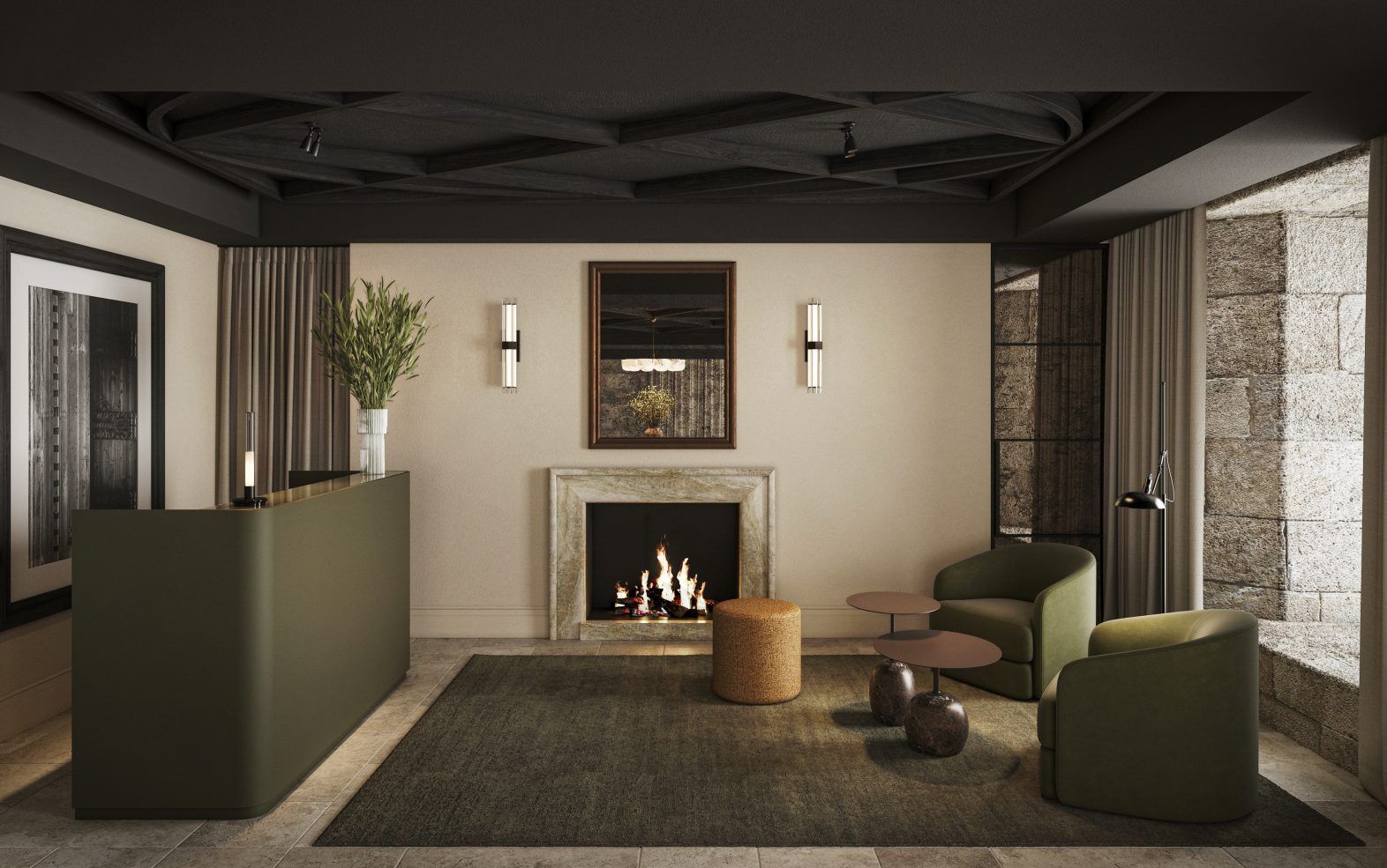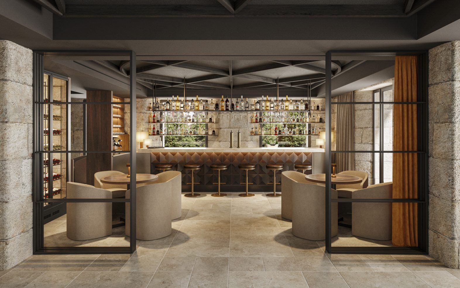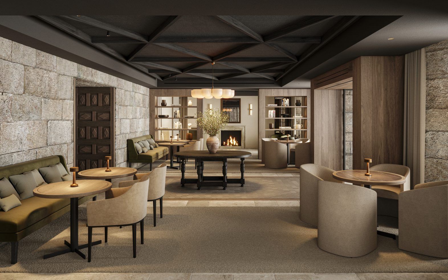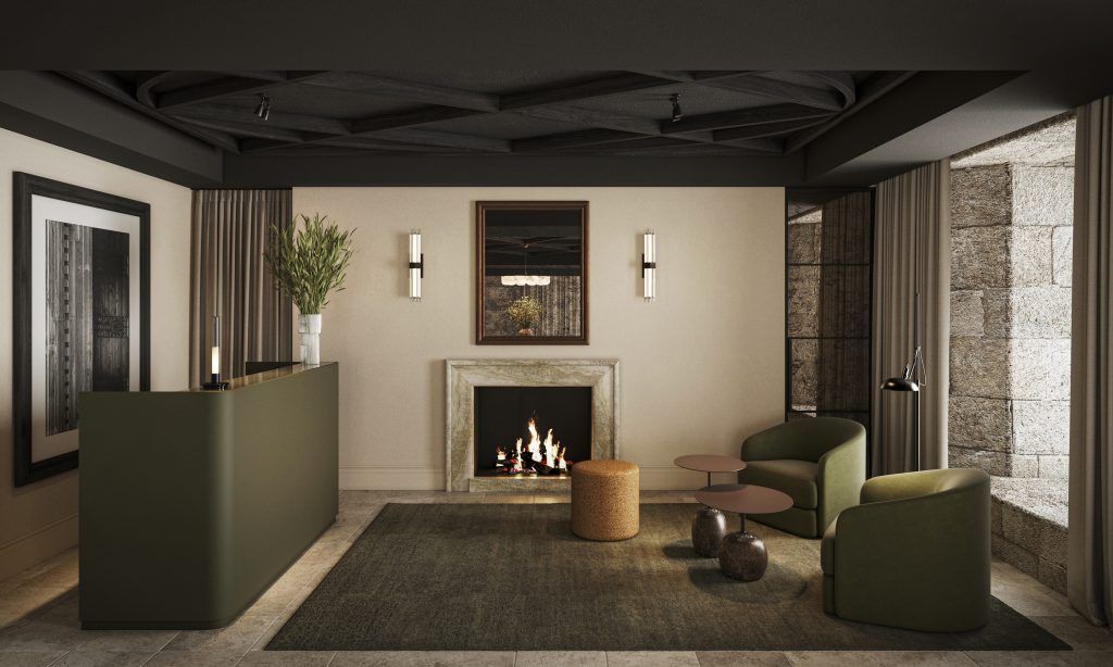El lobby se concibe como un gran salón romántico que mantiene la esencia palaciega, pero y a la vez introduce elementos domésticos para hacerlo cálido y acogedor. Los techos artesonados en madera oscura generan un ritmo visual que otorga carácter y profundidad al espacio, mientras que los muros de piedra original dialogan con el mobiliario contemporáneo en un contraste respetuoso y elegante.