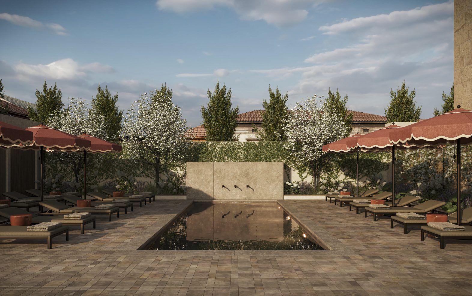 La piscina, ubicada más allá de la zona de restauración, complementa el jardín como lugar de descanso y bienestar, permitiendo disfrutar de un entorno tranquilo y reservado. Por la noche, la iluminación cálida enmarca los muros de piedra y realza la vegetación, transformando el espacio en un escenario íntimo y elegante.