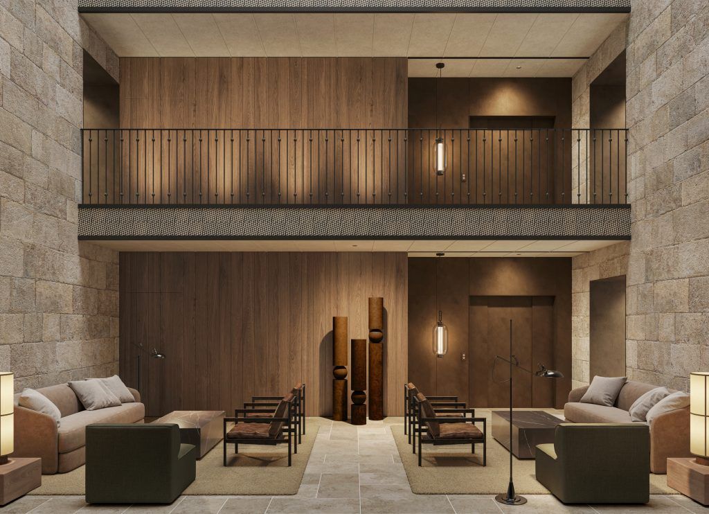 Como parte de la intervención arquitectónica, el interior del palacio fue vaciado manteniendo únicamente la fachada barroca, lo que permitió crear un patio central que articula las circulaciones verticales con ascensores y escaleras. Este espacio, sobrio y contemporáneo, combina piedra y madera cálida, convirtiéndose en un lugar de luz y encuentro que conecta las diferentes plantas.