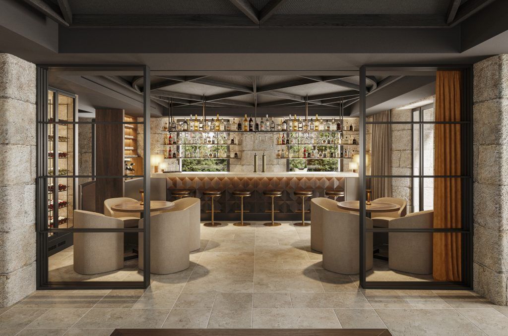 El diseño del winebar gira alrededor de la barra central como protagonista, revestida con geometrías de madera oscura que aportan textura y profundidad.