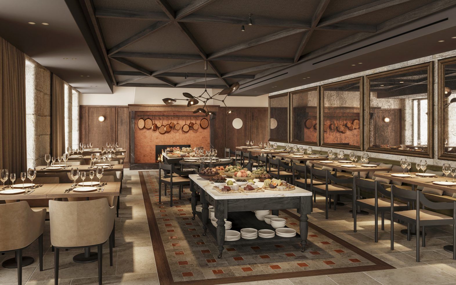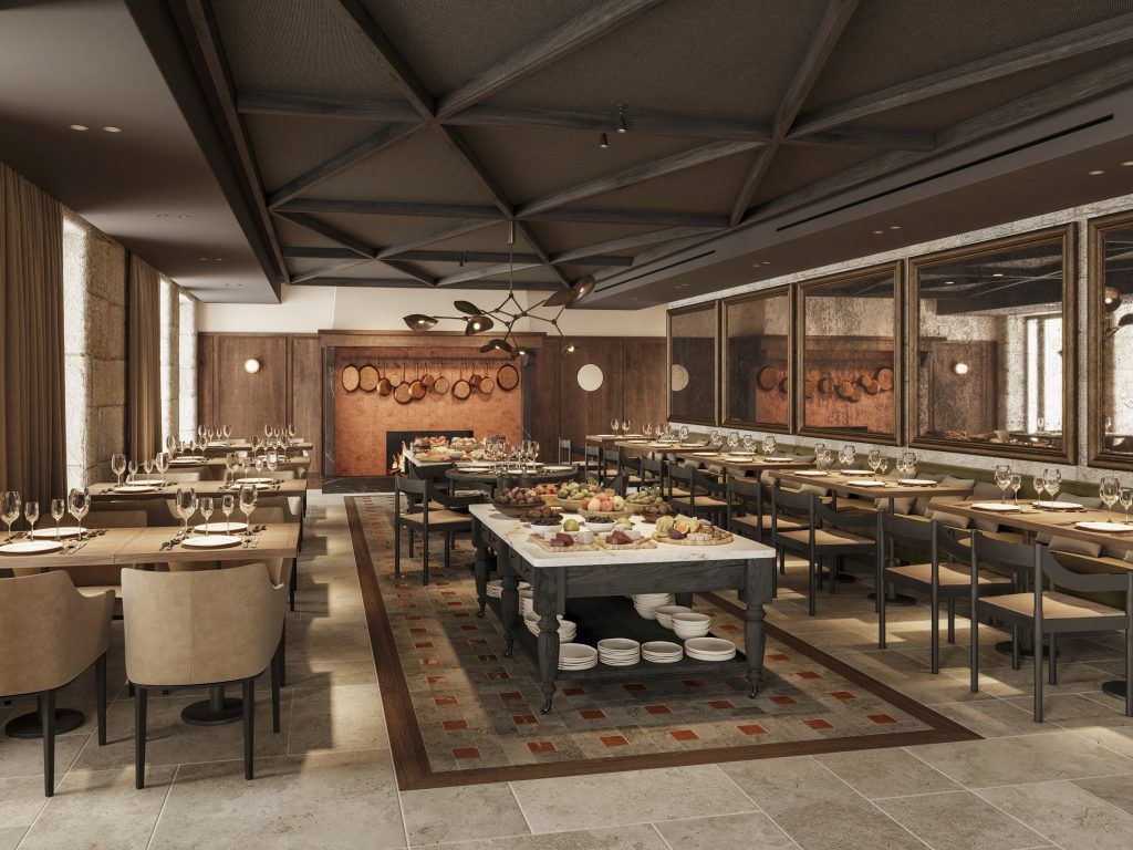 El restaurante conserva la continuidad estética del lobby con techos artesonados oscuros y suelos de piedra natural, creando una atmósfera coherente y elegante. A un lado, grandes ventanales enmarcados con cortinas pesadas dejan filtrar la luz de forma tamizada, reforzando el carácter íntimo del espacio.
