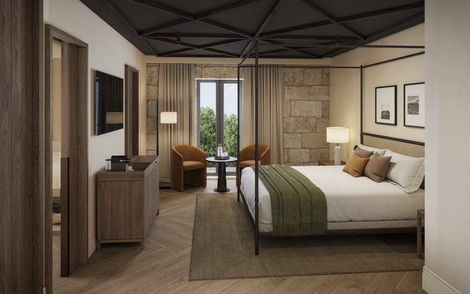 Las habitaciones mantienen la misma narrativa que recorre todo el hotel: un equilibrio entre el carácter histórico del palacio, la calidez doméstica y el diseño contemporáneo. Cada estancia combina muros de piedra original con paramentos suaves en tonos neutros, mientras los techos artesonados en madera oscura aportan identidad y continuidad al diseño. Los suelos en espiga de madera natural refuerzan la sensación de confort y elegancia atemporal.