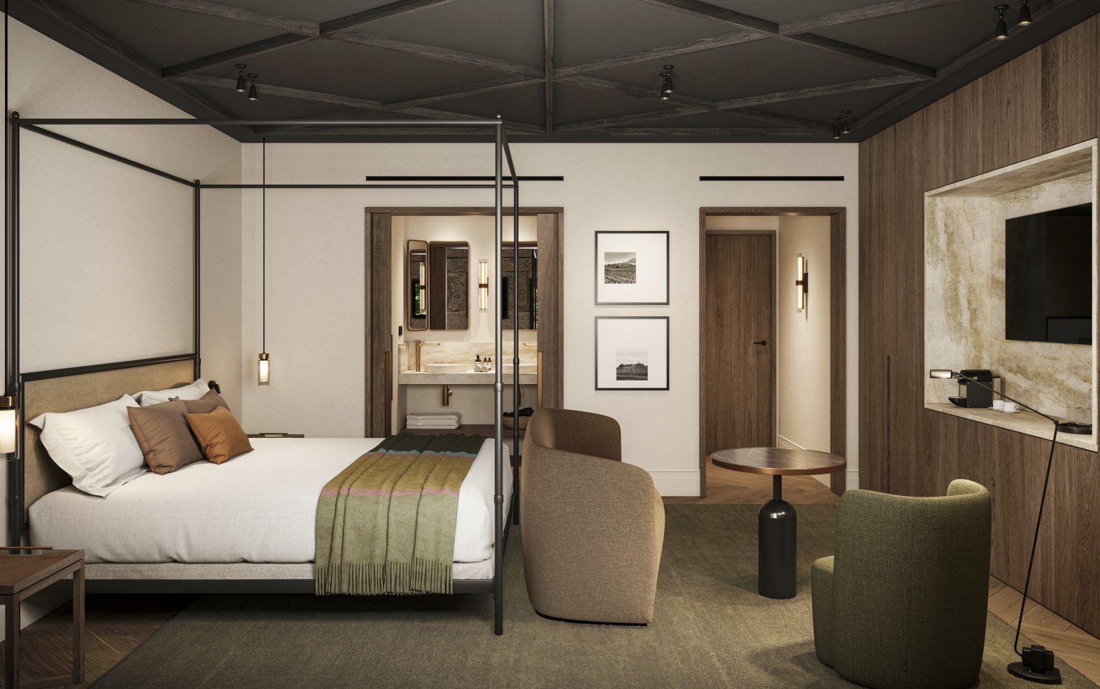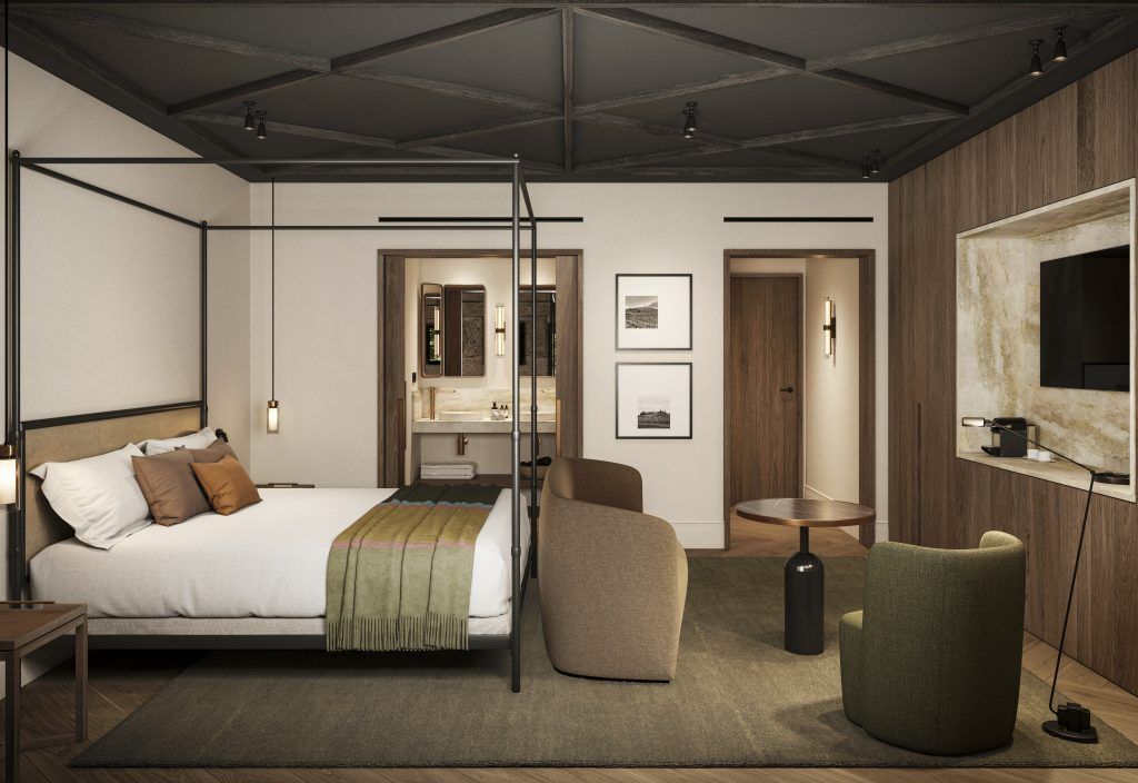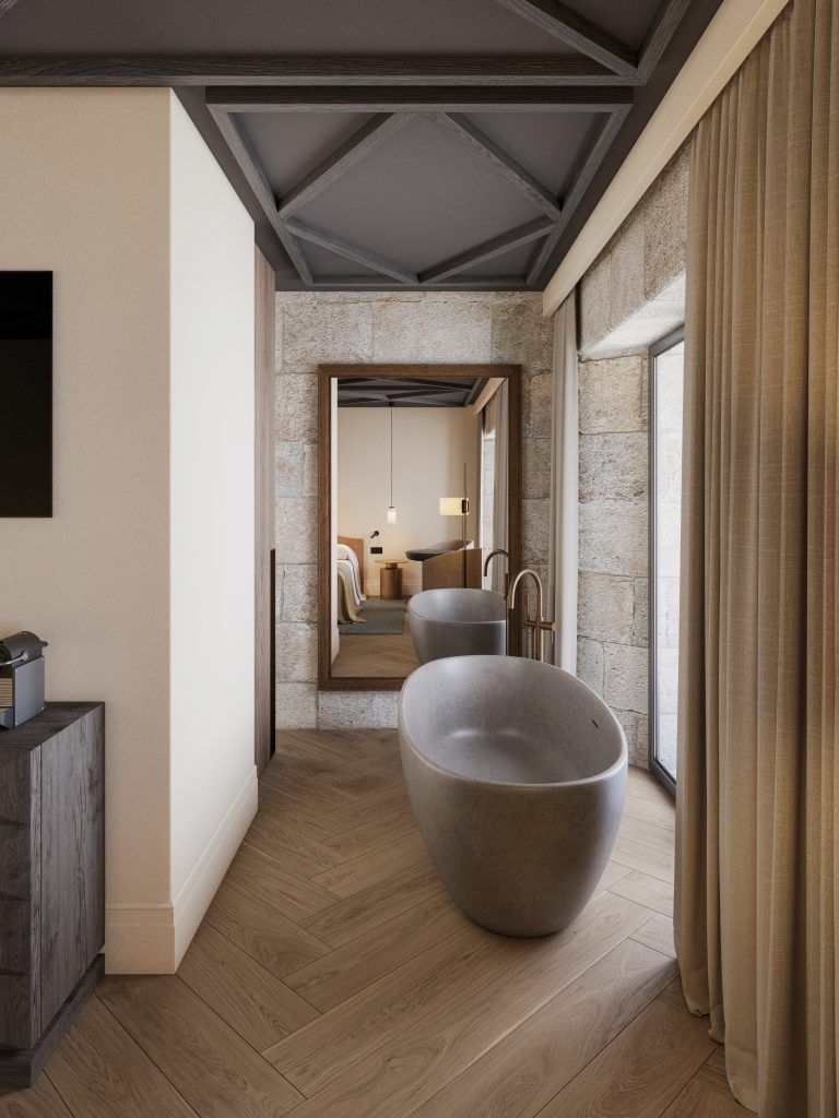 Las suites amplían esta experiencia incorporando bañeras exentas en piedra, integradas en espacios de baño abiertos que aportan un toque de sofisticación y bienestar. En algunas, las camas con dosel metálico definen el espacio con un aire romántico y elegante, mientras sofás y butacas tapizadas en tonos suaves y formas más actuales generan zonas de estar para disfrutar de la estancia con calma.