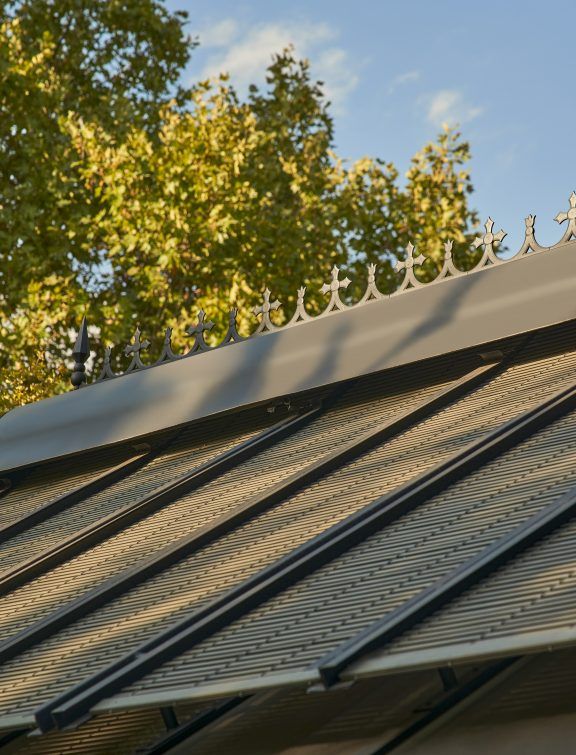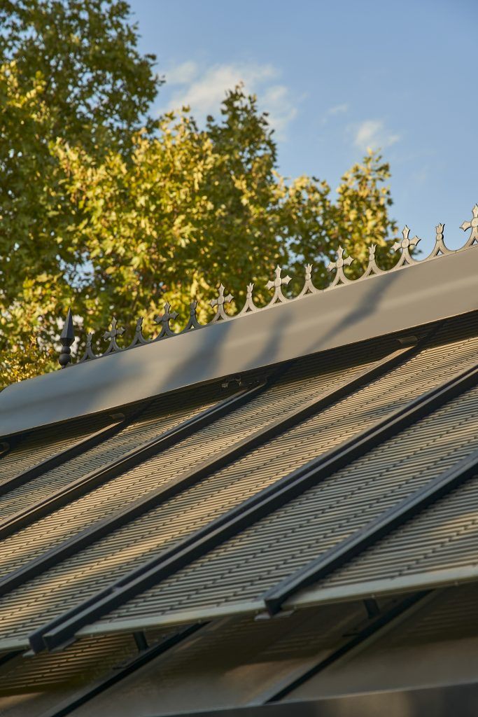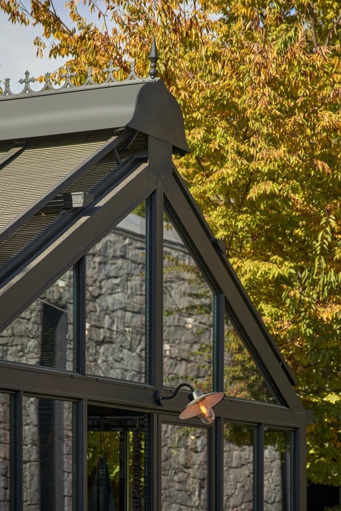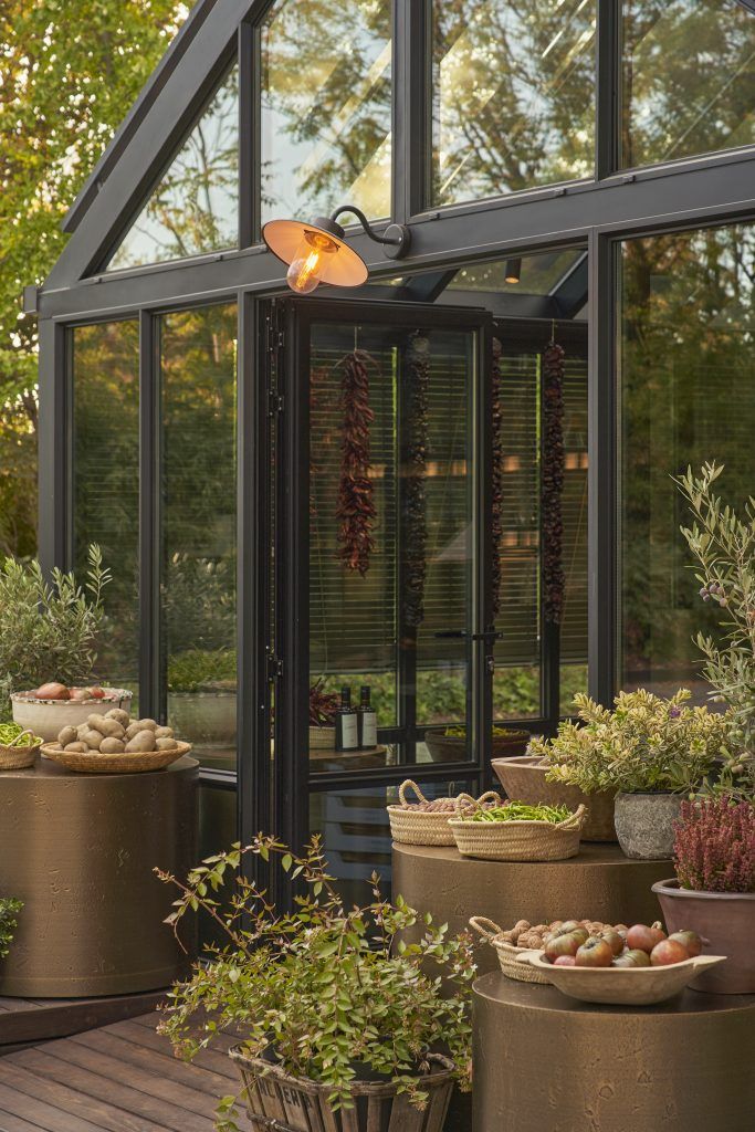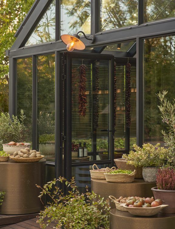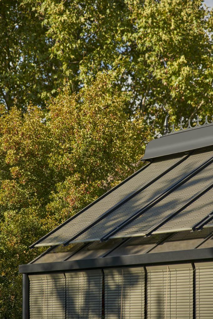 El diseño recupera la imagen de los invernaderos clásicos europeos, reinterpretada desde una mirada contemporánea y romántica. La estructura de aluminio, de líneas elegantes y proporciones delicadas, envuelve un espacio pensado para ofrecer confort interior durante todo el año, donde la luz, la temperatura y la relación con el exterior se equilibran de forma natural. La cubierta incorpora persianas de madera de estilo alicantino, pintadas en un tono verde olivo que dialoga con el paisaje y contribuye a integrar la construcción en su entorno. Estas regulan la entrada de luz a lo largo del día y las estaciones, reforzando el carácter cambiante, doméstico y habitable del invernadero.