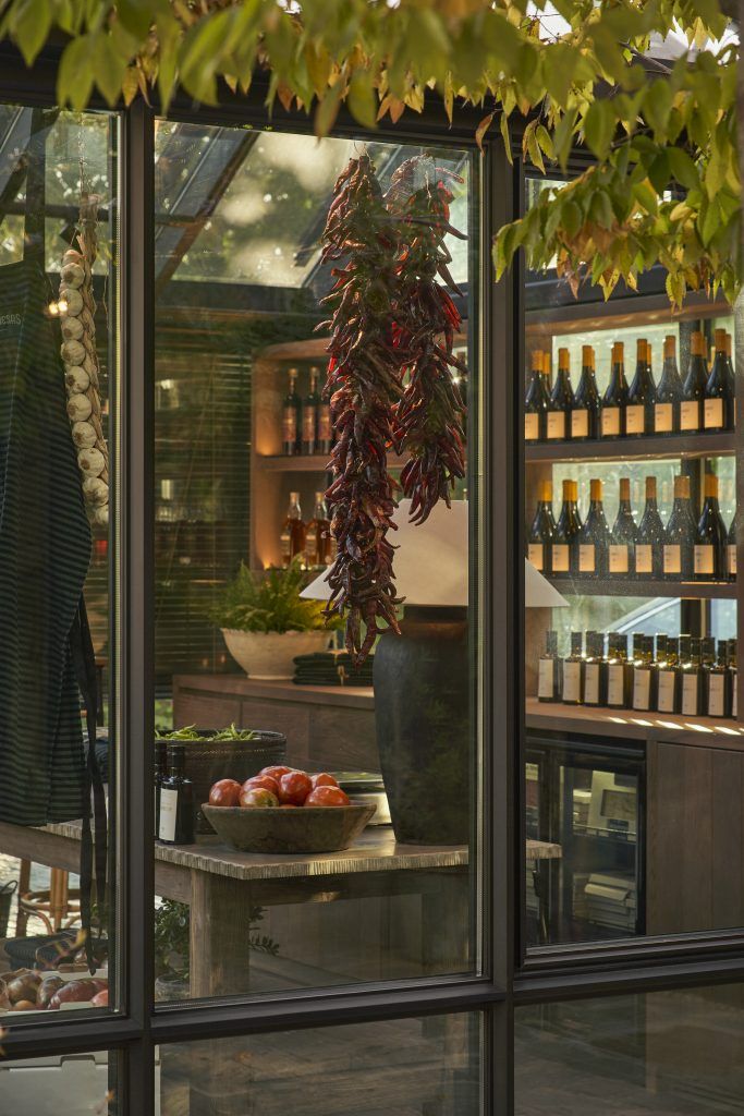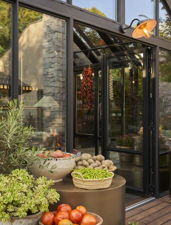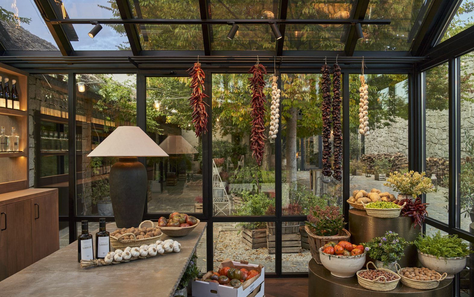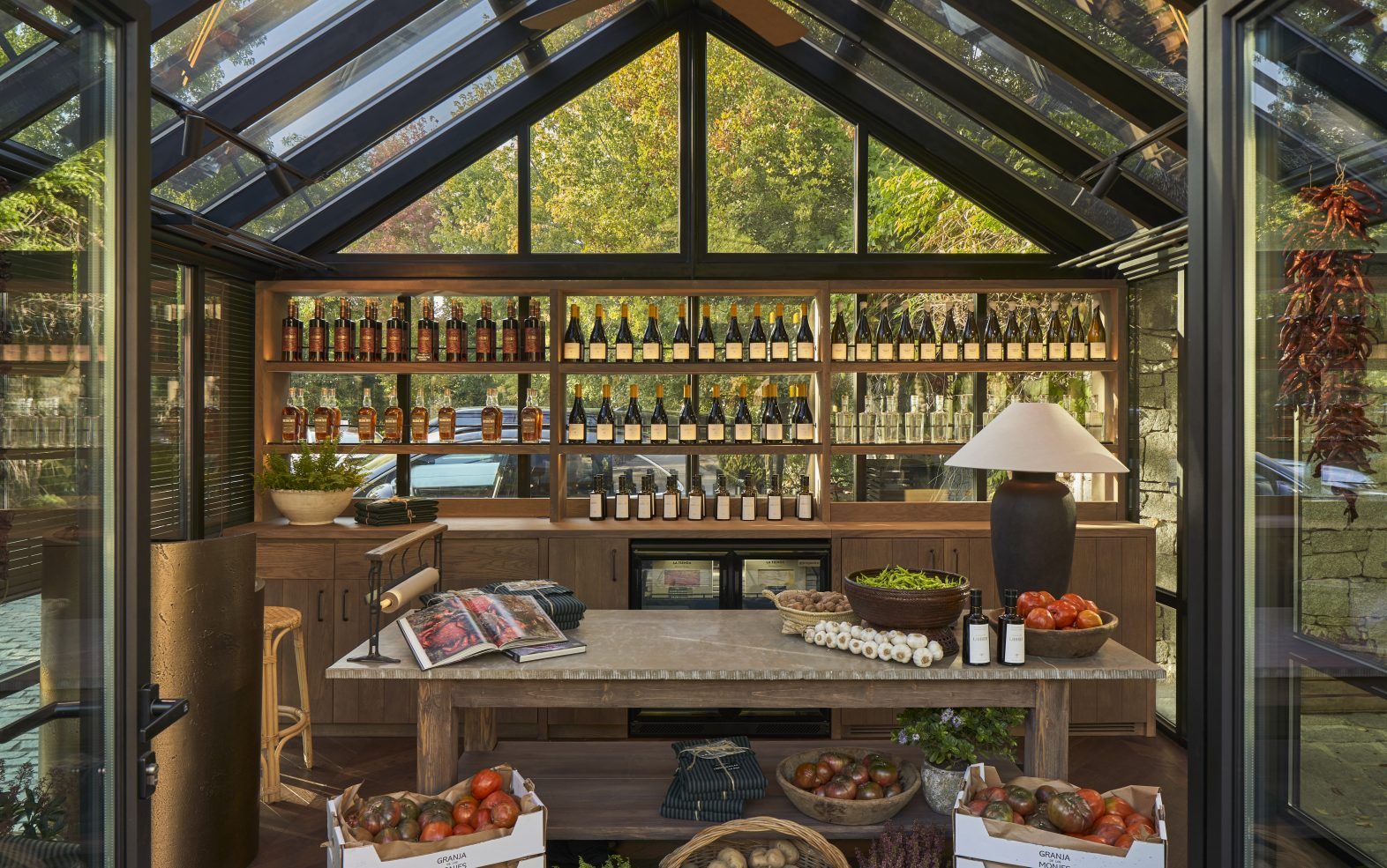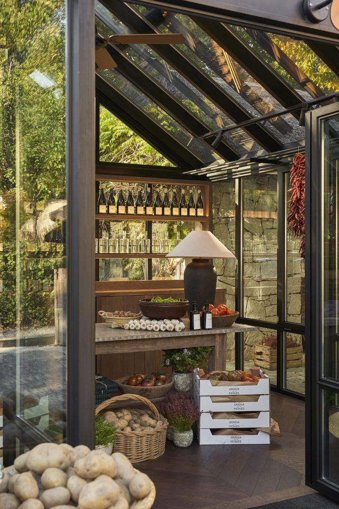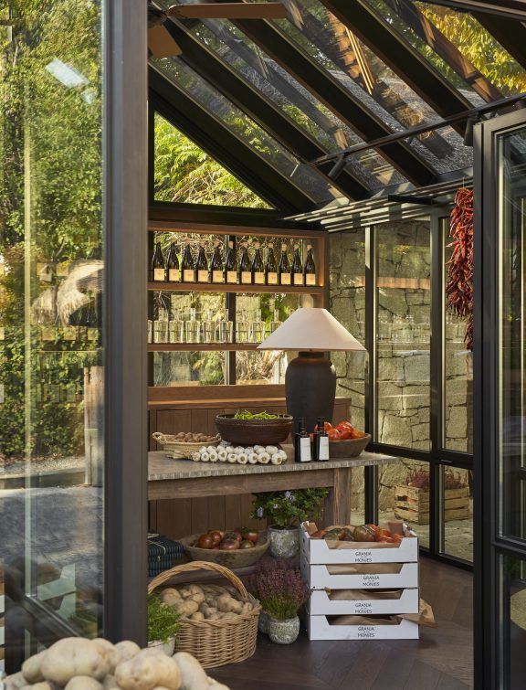 Desde la estructura hasta el mobiliario y la iluminación, cada elemento ha sido proyectado desde cero para integrarse con naturalidad en el entorno y transmitir la identidad del lugar. El encargo nace de una necesidad real y honesta: hacer visible aquello que da sentido a la cocina. Ofrecer a los clientes la posibilidad de adquirir los productos de la huerta con los que se elaboran los platos de la carta, verduras y hortalizas que nacen en su propia finca, la Granja de los Monjes, situada en El Bierzo.
