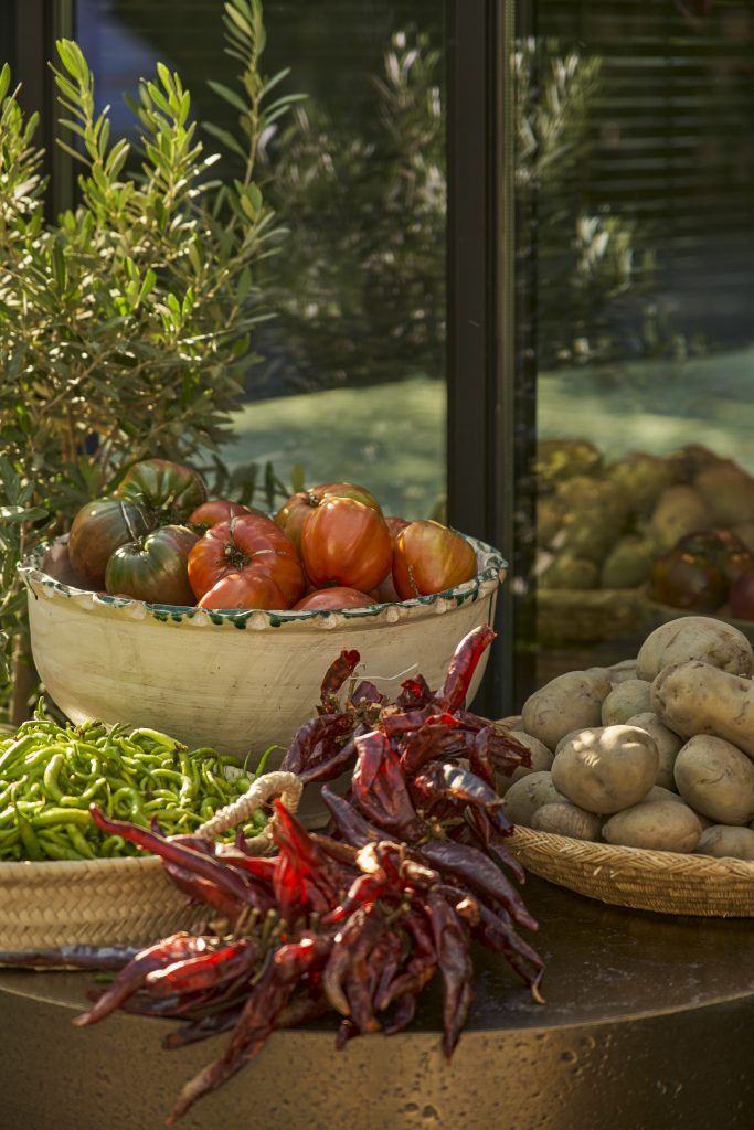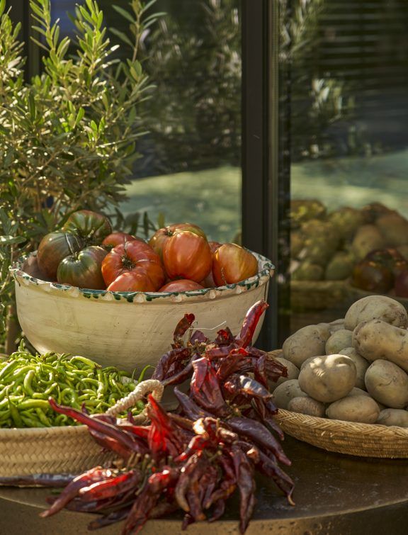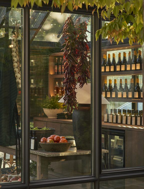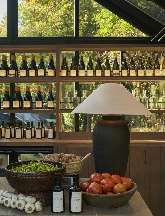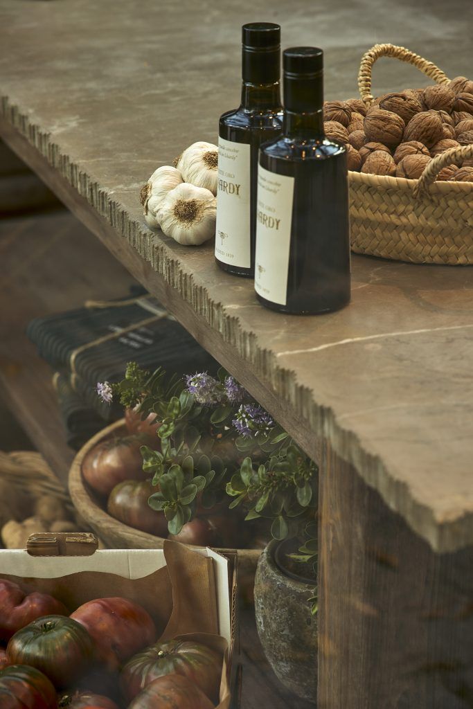 En la parte posterior, un mueble de roble en tono tabaco alberga las conservas y productos gourmet envasados. En la zona frontal y exterior, una selección de productos frescos de la huerta se dispone sobre pedestales circulares de bronce natural, diseñados a medida y organizados de forma flexible, reforzando la relación directa entre el espacio y el producto.