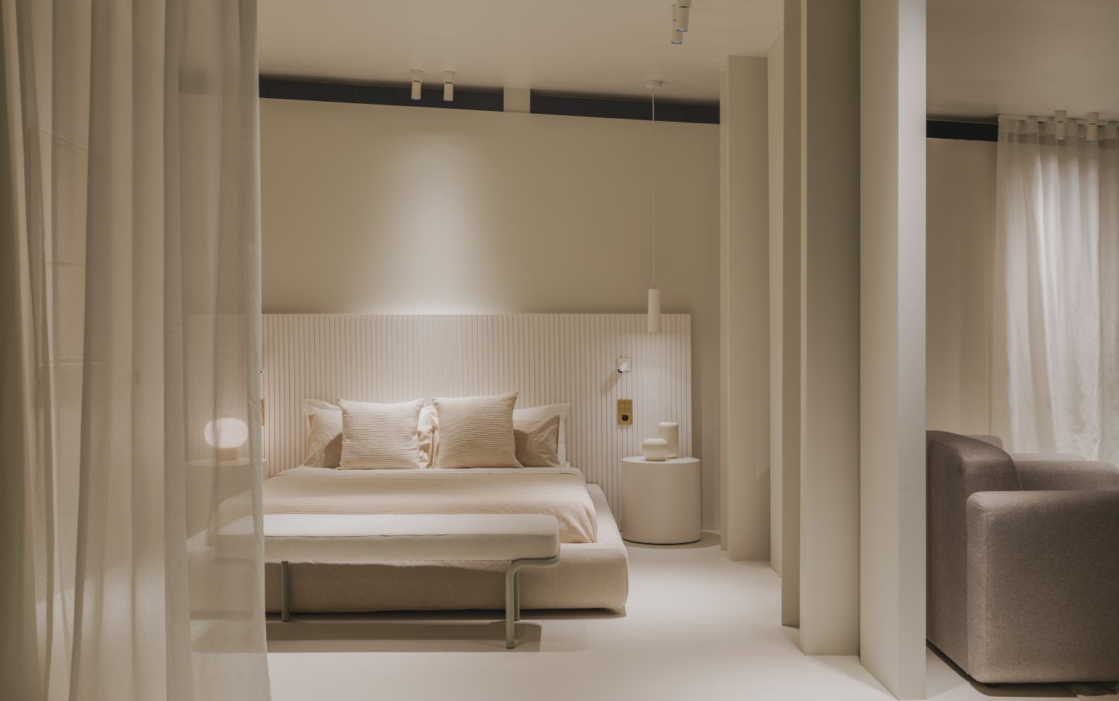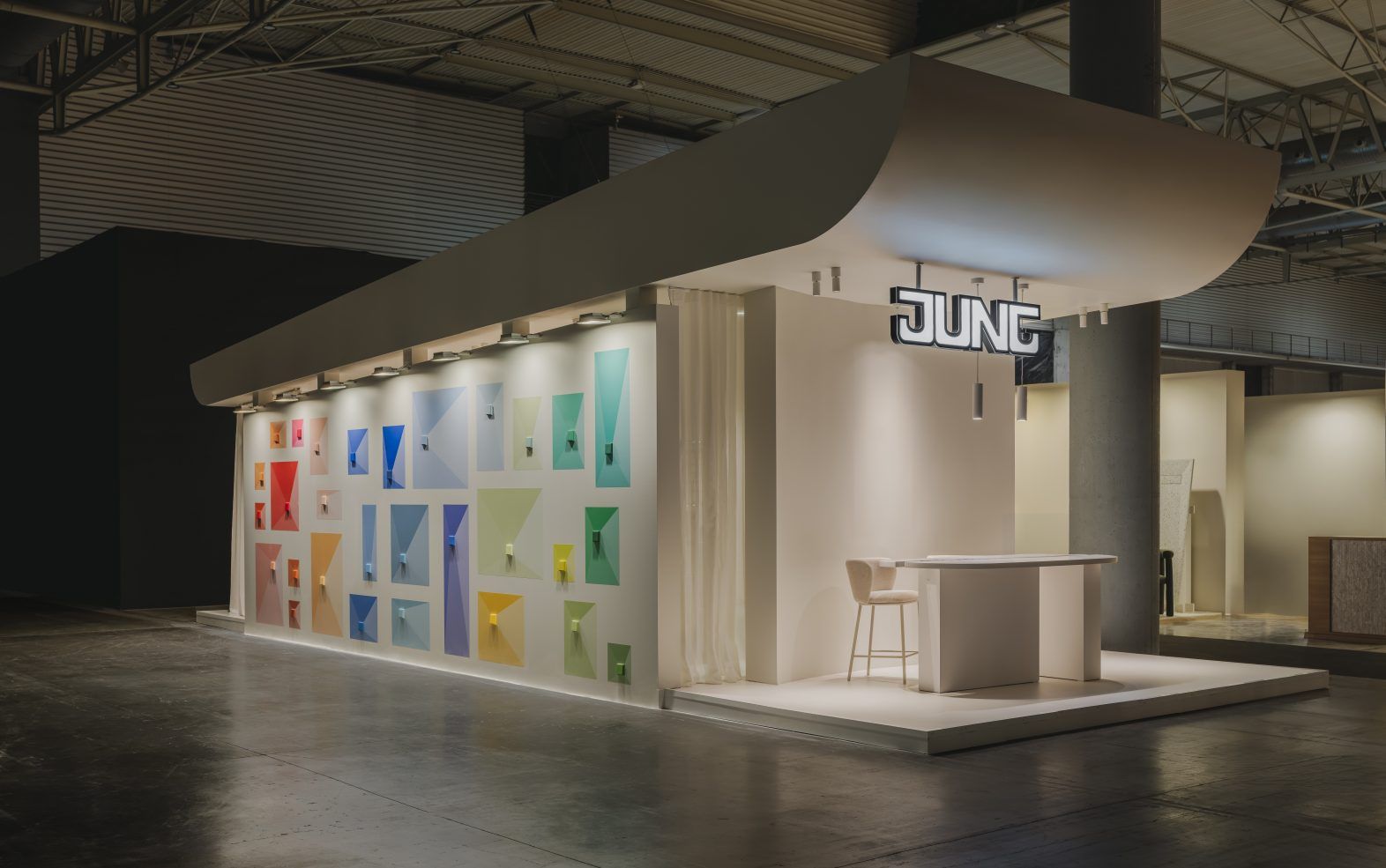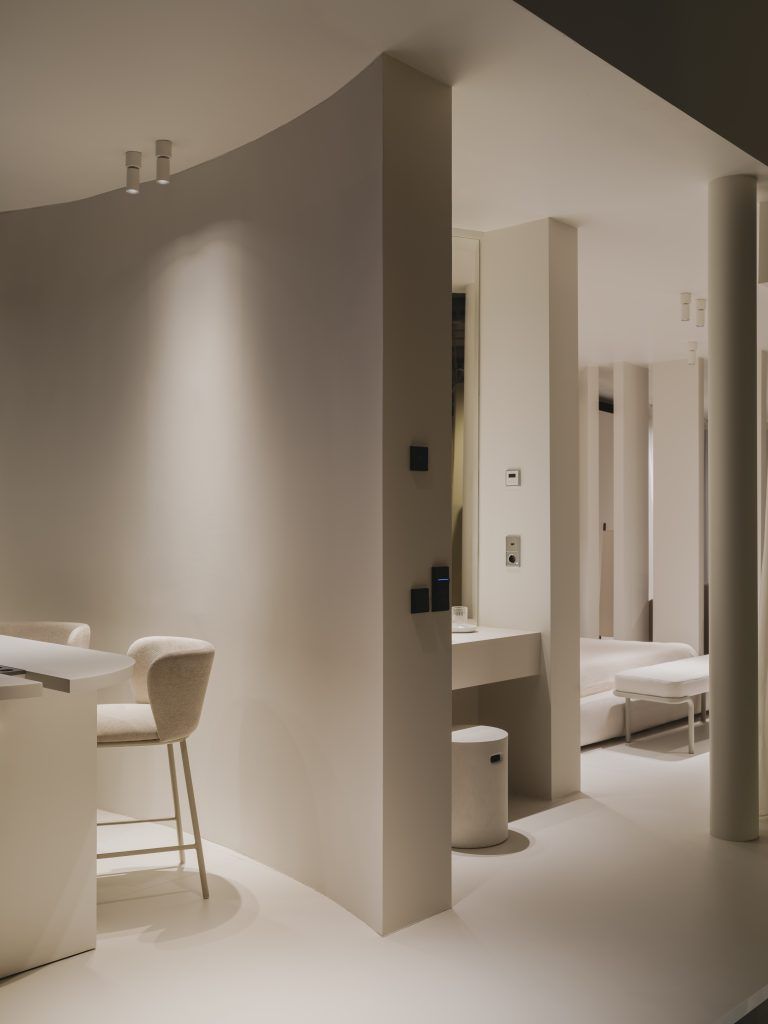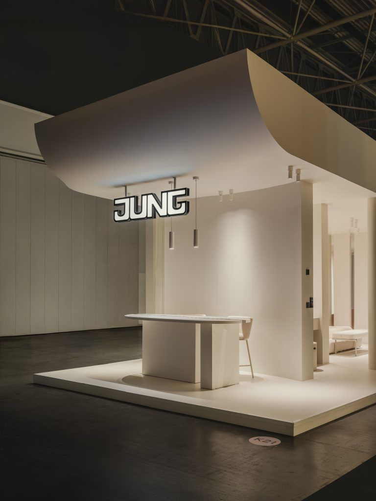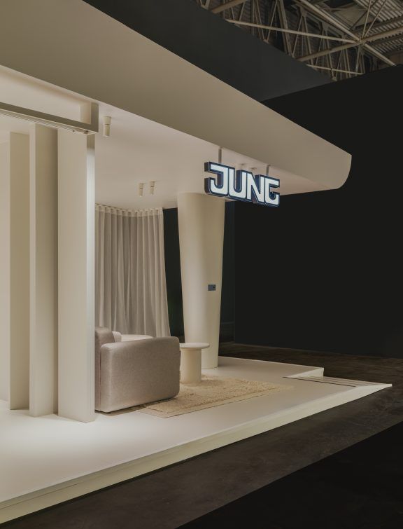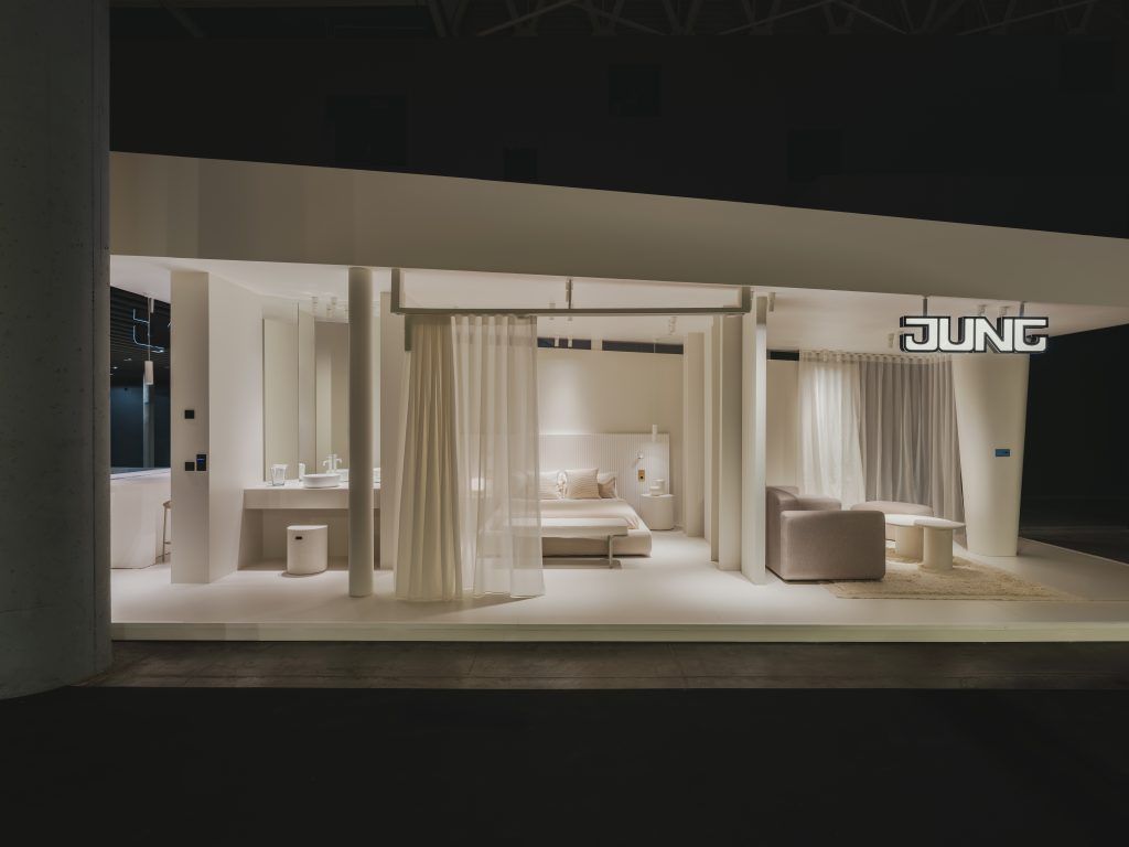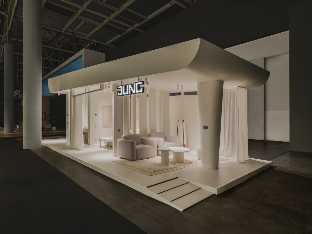 En medio del bullicio de la feria Interihotel 2025 en Barcelona, Trenchs Studio concibe para JUNG un stand de feria que actúa como un respiro: un refugio blanco y sereno que invita a bajar el ritmo. El diseño de stand ferial, bañado por una luz suave y cuidadosamente controlada, recrea la atmósfera de una habitación de hotel contemporánea, donde la calma y la claridad espacial se convierten en protagonistas.