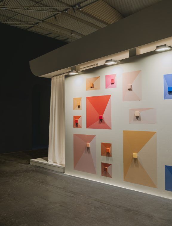 El proyecto también toma como referencia la paleta cromática de Le Corbusier, tanto en los colores de los mecanismos como en la composición de la gran pared expositiva del stand: una constelación de figuras y tonos que resuelve la cara más oculta y recuerda la relación entre arquitectura, color y percepción. Esa pared, situada en el exterior del volumen principal, funciona como un manifiesto visual que conecta la vibración del color con la precisión industrial del producto.