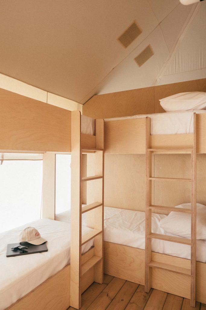 En las tiendas de glamping, el proyecto de interiorismo encuentra un equilibrio entre confort y sencillez a través de una organización funcional y amable, donde soluciones integradas refuerzan la sensación de refugio. Las grandes aperturas y los cerramientos ligeros permiten que el paisaje forme parte constante de la experiencia de alojamiento, diluyendo el límite entre interior y exterior. La continuidad cromática con las zonas comunes contribuye a integrar las unidades en su entorno, mientras que un juego de planos de madera de abedul, incorporando el color de la marca a modo de un gran Mondrian, aporta identidad y carácter al espacio interior.